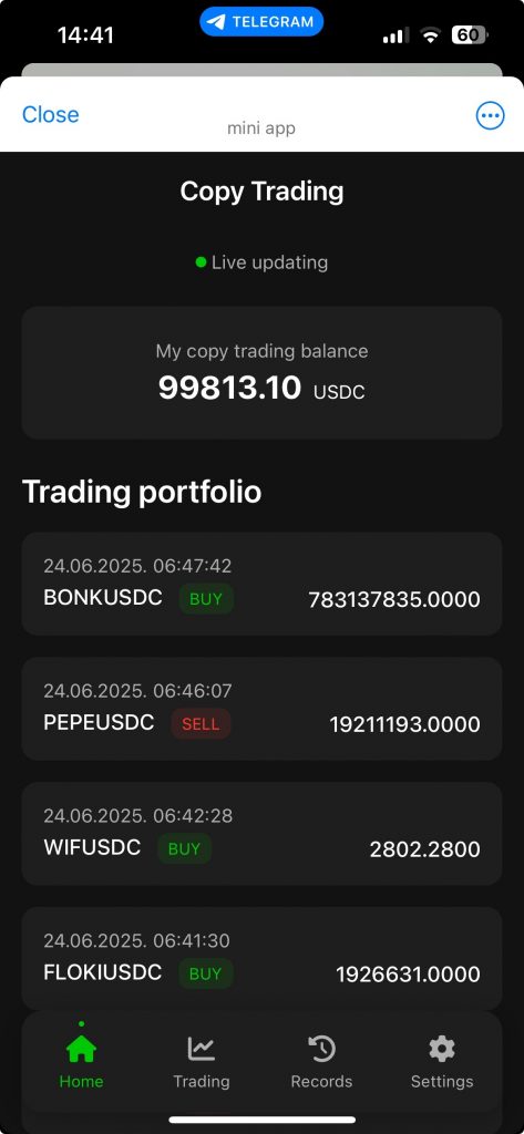 This Telegram crypto trading bot allows you to automatically copy trades from AI trading account to your own crypto trading account in different crypto exchanges: Binance, Coinbase, OKX or Bybit.